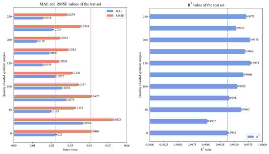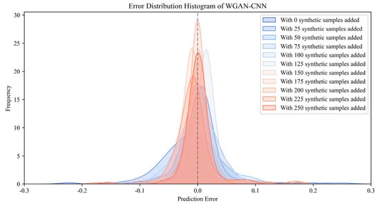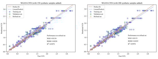 Hence, in present study, the synthetic samples used to augment the training set were composed of samples generated by two different WGAN generators (Dense layers and Convolutional layers). By assigning a fixed random seed, the synthetic data were randomly sampled for each group of CNN training. Different synthetic samples were added to the original training set while keeping the refined set unchanged, resulting in the outcomes shown in Figure 16 and Figure 17. It can be observed that the performance of the WGAN-CNN models was obviously improved when 100 to 200 synthetic samples were added in the training set. Particularly, the WGAN-CNN models with 150 and 200 groups of synthetic samples provided excellent results, in which the R2 values approached 0.9979 and 0.9978, respectively. Additionally, the corresponding MAE values were 0.0154 and 0.0119, and the RMSE values were 0.0238 and 0.0243, respectively. According to the KDE plot illustrated in Figure 17, the WGAN-CNN model trained with 200 synthetic samples exhibited the optimum performance, with the errors being concentrated at zero. The scatter plots with linear fit lines are shown in Figure 18, which compared the predicted UCS values from these two WGAN-CNN models with the actual UCS values. It can be observed that the scatter points of the WGAN-CNN model with 200 synthetic samples were closer to the perfect fit line. Thus, it can be concluded that the performance of the WGAN-CNN model with 200 synthetic samples was slightly better than that of the model with 150 synthetic samples. In the subsequent sections, the term “WGAN-CNN” refers to the WGAN-CNN model with the incorporation of 200 WGAN-generated synthetic samples.