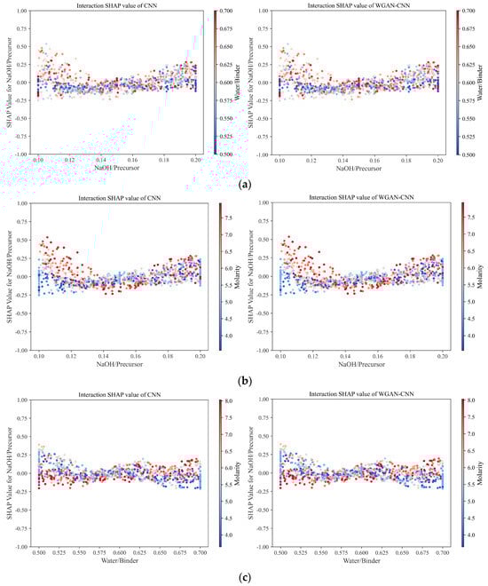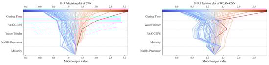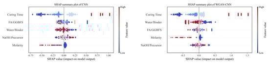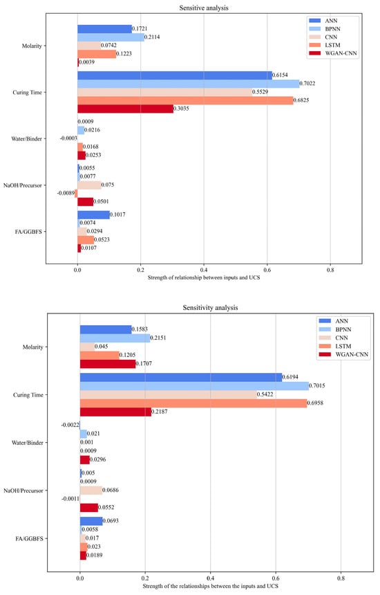In the data processing section, to mitigate the effect of different scales, the collected dataset was first standardized using Z-score normalization, as shown in Equation (14). The original real data were then divided into a training set and validation set at the ratio of 9:1. In addition, the mean UCS for the parallel samples with the same mixing proportion in the original real data was defined as the refined set. In the model development part, five different DL models were constructed: ANN, BPNN, CNN, LSTM, and WGAN-CNN. Notably, the WGAN-CNN model involved the synthetic samples generated by WGAN, which were added into the training set for the CNN model. For model assessment, three evaluation metrics (MAE, RMSE, and R2) and the K-Fold cross-validation method were employed. In the interpretable analysis section, the best-performing DL models were further analyzed by the three types of interpretable methods (sensitivity analysis, SHAP, and PDP) to further validate the feasibility of the DL models in the prediction of the mechanical properties of the OPG-stabilized soil.