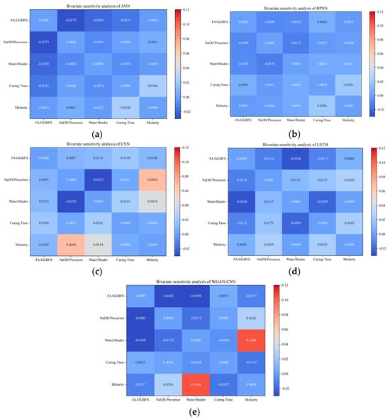 Sensitivity analysis reveals how independent variables affect the output []. The specific calculation process involves randomly sampling the independent variables within a specified range and using a pre-trained model to predict the output. By employing the one-at-a-time (OAT) method to control variables, the sensitivity analysis perturbs only one independent variable at a time while keeping other variables at their nominal values, and thus the relationship between the output and that variable can be determined [,]. Sensitivity analysis can be divided into a global sensitivity analysis and local sensitivity analysis. In contrast to the local sensitivity analysis, the global sensitivity analysis focuses on the impacts of all input variables on the output and can consider interactions between variables. Notably, this study adopted a global sensitivity analysis method based on Sobol coefficients, which include first- and second-order sensitivity analyses. The first-order sensitivity analysis primarily focuses on the impacts of individual input parameters on the model output. The second-order sensitivity analysis reflects the degree to which interactions between two input parameters affect the model output, providing a more comprehensive understanding of how interactions between parameters influence the model output. The calculation of the first-order sensitivity Sobol index is shown in Equation (5), while the calculation of the second-order sensitivity Sobol index is shown in Equation (6).