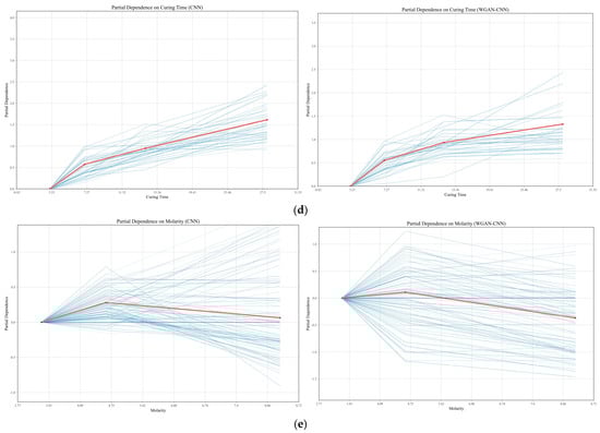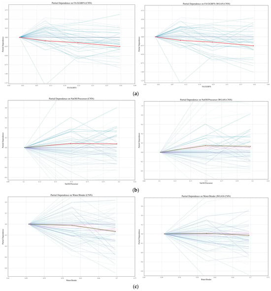 The Partial Dependence Plot (PDP) is a visualization technique that illustrates the marginal effects of features on the predictions of the trained ML model []. Its advantage is to generate plots to display the relationship between the target and input variables. This makes it easier to comprehend how each input specifically affects the model’s predictions, which improves the interpretability of the DL models. The PDP method elucidates the relationship between inputs and outputs by utilizing all available data points within the dataset [,]. The partial dependence function can be estimated by calculating the mean values within the training data, as illustrated in Equation (10):