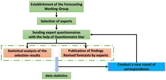 In the process of implementing the Delphi method, the following steps are adhered to: establishing a forecasting working group, selecting experts, sending out expert inquiry forms, collecting and organizing opinions, providing feedback, repeating the inquiry process until consensus is reached, and comprehensively processing the opinions of experts to ultimately draw conclusions. The detailed procedure of the Delphi survey is shown in Figure 1.