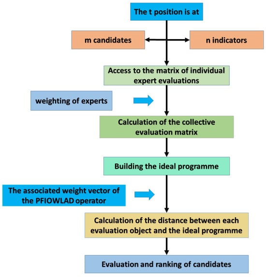 This study employs a systematic evaluation process, as illustrated in Figure 2, strictly adhering to the methodological principles of scientific rigor. Initially, the study establishes an assessment committee comprising t experts with profound professional knowledge and practical experience in their respective fields. This committee is tasked with conducting a comprehensive and in-depth evaluation of m candidate subjects and n indicators, thereby forming an individual evaluation matrix that ensures the thoroughness and professionalism of the evaluation process. After establishing the weights of each expert, the collective evaluation matrix is further calculated. The normal distribution method is utilized to determine the relative weight vector of the PFIOWLAD operator, a step that ensures the rationality and scientific nature of weight distribution in the evaluation process. Subsequently, the collective evaluation matrix is integrated using the PFIOWLAD operator to calculate the distance between each evaluation subject and the ideal solution. Ultimately, the evaluation subjects are ranked based on the computational results, providing clear and scientific criteria for decision makers, effectively supporting the decision-making process. This process not only enhances the objectivity and accuracy of the evaluation but also offers a powerful analytical tool for decision making in complex fields such as underground engineering.