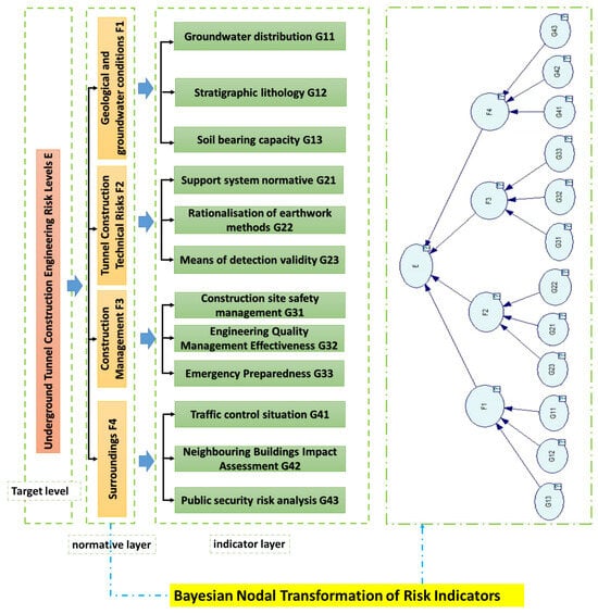 Underground tunnel engineering, as a vital component of urban infrastructure construction, is characterized by complex construction environments, high technical requirements, and significant safety risks [36]. Analyzing the main risks faced during the construction process of underground tunnel engineering in recent years reveals that the risks in underground tunnel engineering mainly exist in four major criteria indicator layers: geological and groundwater conditions, foundation pit construction technical risks, construction management, and the surrounding environment. In conjunction with relevant materials and expert consultation, 12 indicators were selected. The geological and groundwater conditions included three indicators: distribution of groundwater, rock formation, and soil bearing capacity. The foundation pit construction technical risks included three indicators: the standardization of the support system, the rationality of soil construction methods, and the effectiveness of detection methods. Construction management included three indicators: the state of safety management at the construction site, the effectiveness of engineering quality management, and the completeness of emergency plans. The surrounding environment included three indicators: traffic control, assessment of the impact of surrounding buildings, and public safety risk analysis. The construction of the underground tunnel construction risk evaluation index system is shown in Figure 3.
