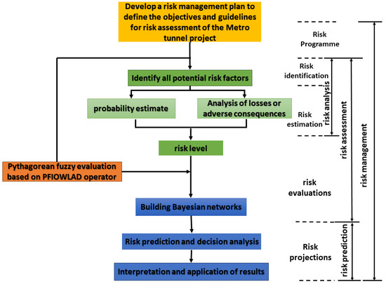 However, in the complex environment of underground construction, the task of risk assessment faces multiple challenges and uncertainties. Traditional risk assessment models often heavily rely on expert evaluation, where the influence of subjective factors cannot be overlooked, limiting the objectivity and accuracy of the assessment results. Naji [5] indicated that using the Delphi method to assess the factors of digital transformation in the construction industry can effectively identify the critical factors at the construction phase. This study draws on this method by consulting experts to assess risk factors, but at the same time, it recognizes the limitations of expert subjectivity in traditional models. To overcome this limitation, Abramov I [6] and his team’s research provided an integrated approach that combined the analytic hierarchy process (AHP) with Monte Carlo simulation techniques to conduct a systematic assessment of risk factors in the construction phase for construction companies. This study employs a similar integrated approach, enhancing the quantitative analysis capabilities of risk assessment by introducing Pythagorean fuzzy numbers and Bayesian networks. Lapidus A [7] provided a survey method that offered a reference for this study to collect information on risk factors. Zhu Y [8] proposed a genetic taboo algorithm that not only enhanced the efficiency of enterprise evaluation but also offered the possibility of reducing the time required to establish assessment methods. This study has also considered the application potential of this algorithm in the development process of the risk assessment methodology. The research by Khan S [9], which integrated historical accident data with expert assessment, provided a comprehensive evaluation of railway accident risks and offered valuable experience for this study in the assessment of risk probabilities and consequences. The combination of the generalized intuitionistic fuzzy soft set and the TOPSIS decision-making model proposed by Wu H [10] provided an innovative approach for this study in the construction of the evaluation index system and the calculation of weights. Ansari R [11] employed the best–worst method (BWM) to reasonably allocate weights to these criteria and subsequently innovatively introduced the fuzzy FUZZY VIKOR method for the comprehensive ranking of existing risks, providing scientific support for the risk priority setting in this study. Ilczuk P [12], based on expert interview data and employing a risk analysis method grounded in fuzzy set theory, enhanced the safety of the railway traffic control industry. Gul M [13] integrated a Pythagorean fuzzy analytical hierarchical process with the fuzzy FUZZY VIKOR method in a risk assessment framework, providing an exemplary model of methodological innovation and integration for this study. Çalık A [14] developed a novel group decision-making method within the Pythagorean fuzzy environment by integrating the AHP and TOPSIS methods. The innovation of this approach lay in its combination of two established decision-making techniques, enhancing the consistency and accuracy of the group decision-making process. Chen Q Y [15] proposed a model that employed Fermatean fuzzy linguistic sets (FFLSs) and the combination compromise solution (CoCoSo) method, specifically aimed at risk assessment and prioritization of occupational hazards. The model enhanced the expressive power and flexibility of risk assessment by utilizing FFLSs to handle the complex and vague risk evaluations provided by experts. The research by Shete P C [16] employed a Pythagorean fuzzy analytic hierarchy process (AHP) framework to study the factors promoting sustainable supply chain innovation (SSCIEs). This indicated the potential application of Pythagorean fuzzy set theory in other fields such as supply chain management, providing an interdisciplinary perspective for this study. Ak M F [17] emphasized the importance of multi-attribute decision making in risk analysis and noted that the analytic hierarchy process and TOPSIS are two commonly used MADM methods. These methods have been employed in this study to construct the evaluation index system and calculate the weights of indicators, ensuring the systematic and scientific nature of the risk assessment. Wang L [18] improved the existing fuzzy TODIM method, proposing an approach that retained more information during the decision-making process. This refinement helped to prevent the loss of information when translating fuzzy preferences into crisp values, enhancing the reliability of decision-making. Zhang Z [19], by analyzing the application of the interval type-2 fuzzy TOPSIS (IT2-FTOPSIS) method in risk assessment, pointed out the shortcomings of existing research in considering utility functions. To address this, a novel IT2-FTOPSIS method incorporating utility functions was developed to more accurately assess the operational risks of subway stations. Wang Y M [20] focused on the multi-attribute decision-making problems in a fuzzy environment, proposing a fuzzy TOPSIS method based on alpha level sets, and provided the corresponding nonlinear programming solution algorithm. The study also explored the intrinsic connections and differences between the fuzzy TOPSIS method and the fuzzy weighted average method. It not only demonstrated the unique advantages and application potential of the proposed method but also revealed the essential distinctions and room for improvement between this approach and other decision-making procedures in handling fuzzy information. Liu P [21] introduced the concepts of complex q-rung orthopair fuzzy sets and linguistic sets, which were utilized for dealing with uncertain information in multi-attribute group decision-making problems. The manuscript also brought forth the Heronian mean and geometric Heronian mean operators, which effectively aggregate q-rung orthopair linguistic fuzzy numbers into a unified element. Th