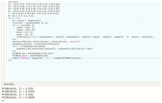 Utilizing the method of normal distribution [41], we could derive the associated weight vector for the PFIOWLAD operator as , which was . To evaluate the candidate schemes, we calculated the distance between each candidate solution and the ideal solution , selecting the expert evaluation with the minimum distance as the index for the probability level of risk assessment. The Beidou Tianyuan method was employed to calculate the distance between the candidate assessment results and the ideal assessment results for evaluation purposes, as follows: