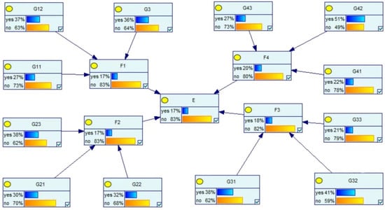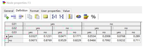 Based on the judgment of Pythagorean fuzzy numbers, representative evaluation information was selected. Experts, according to the proportional scoring system, conducted a comparative analysis of the importance of risk factors at the same hierarchical level and performed a quantitative scaling to construct a judgment matrix. The weight vector was calculated separately using the geometric mean method. Here, the weight vectors of the three experts judged to be representative of were averaged to serve as the final weight vector. Taking the calculation of the weight vector for to as an example, the respective weight vectors were , ,, and . Similarly, the weight vectors for to was , for to was , and for to was . The weight vector for to was defined as . Based on this, a Bayesian network topology was established and probability weights between various factors were inputted. Additionally, the content link for the survey questionnaire conducted via the Wenjuanxing platform is https://www.wjx.cn/vm/tevHLKI.aspx#, accessed on 13 July 2024. Due to space limitations, only the conditional probability calculation for the ‘Surrounding Environment ’ node is illustrated as an example. Experts determined that the probability of the occurrence of ‘Emergency Plan Completeness ’ was caused by ‘Construction Management ’. Utilizing GeNIe 4.0 software for computation, where the influence proportion of ‘Construction Management ’ was 0.41, an input of 0.41 was entered under ‘yes’ and 0.59 under ‘no’. Based on the probabilities of occurrence and non-occurrence of each indicator, the probabilities of each accident could then be derived, as shown in Figure 7.