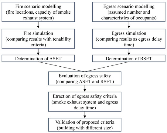 Figure 1 shows a flowchart that illustrates all the procedures for the derivation of the egress safety criteria in this study. The first step was fire simulation. Fire scenarios were set up at two fire locations and seven smoke exhaust system capacity levels were used as variables, and the available safe egress time (ASET) was calculated for each case. The second step was egress simulation. Egress scenarios were set up for nine egress delay time cases, and the required safe egress time (RSET) was calculated for each case. In the third step, the egress safety was evaluated for each case by comparing the ASET and the RSET. In the last step, the egress safety criteria were presented, based on the simulation results. In addition, the proposed criteria were validated by applying them to a small studio building with a floor plan that was different to that of the prototype building and by comparing the simulation results.