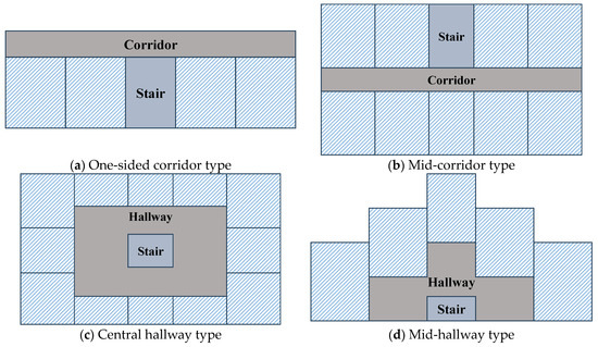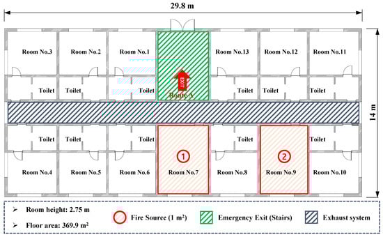The Fire Dynamics Simulator (FDS) [14] has been widely used in fire simulations and has been rigorously validated through a wide range of studies [15,16,17,18]. Accordingly, in this study, FDS was selected to model fire scenarios in studio residential buildings. Figure 2 shows the floor plans of typical studio residential buildings. The floor plans can be classified into four types: one-sided corridor type, mid-corridor type, central hallway type, and mid-hallway type. The egress characteristics in case of fire are different depending on the floor plan. In this study, as shown in Figure 3, the mid-corridor type studio building was set as the prototype building because it is the most common type in Korea. The mid-corridor type studio building has a single exit in the center of the building, and the building was assumed to have a floor height of 2.75 m and a floor area of 29.8 m × 14.0 m. The fire location was set to be directly over the corridor, i.e., Location ①, and in the room on the southeast side, i.e., Location ②, and the burning area was planned to be 1 m2. All smoke exhaust systems were assumed to be installed in the corridor. In Korea, the capacity of the smoke exhaust system is determined according to the standards presented by the Korean Fire Protection Association [19]. The capacity of the smoke exhaust system of the prototype building presented by KFPA is 12.5 m3/s, and in this study, a total of seven capacity levels of smoke exhaust systems (0%, 25%, 50%, 75%, 100%, 125%, and 150%) were examined, as shown in Table 2, considering 12.5 m3/s (100%) as the reference capacity of the smoke exhaust system. To simulate a worst-case scenario, the FDS analysis assumed conditions where openings such as doors were open.