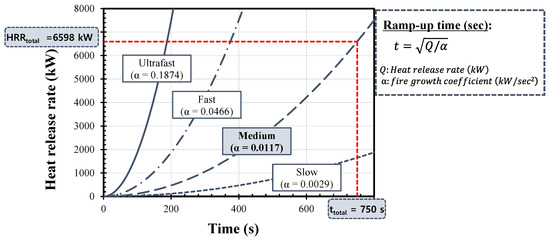 As shown in Table 3, the combustibles in a room of the studio building were assumed to be typical furniture such as desk, chair, television, refrigerator, bed, sofa, and closet. The heat release rate (HRR) of each combustible was obtained from the National Center for Forensic Science (NCFS) database [20], and the fire load was calculated by summing the HRR of all combustibles as 6598 kW (1,648,125 kJ/m2). The fire growth rate was calculated using the t-squared fire growth model [21], as shown in Figure 4. The fire growth type was determined as medium according to the usage of the building, and the fire growth coefficient of 0.0117 was applied accordingly. As shown in Figure 5, the fire simulation modeling was performed by referring to the “Fire Dynamic Simulator User’s Guide” [14], and with reference to this, the size of the mesh was calculated as: