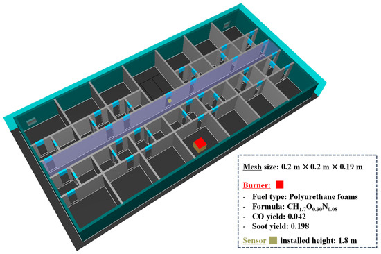 where is heat release rate (kW), is the density of the ambient air (1.204 kg/m3), is the specific heat of the ambient air (1.005 kJ/kg-K), is the temperature of the ambient air (293 K), is the gravitational acceleration (9.81 m/s2), is characteristic fire diameter (m), and is the size of the mesh (m). According to Equation (1), the mesh size was calculated as 0.2 m × 0.2 m × 0.19 m, and the moderate mesh value with a value of approximately 10.8 was selected considering the constraints shown in Equation (2). The height of the detector device was 1.8 m, and temperature, carbon monoxide, carbon dioxide, and oxygen and visibility sensors were installed. The primary purpose of this study is to provide criteria for evaluating egress safety, and the results should be relatively conservative. As shown in Table 3, for conservative evaluation, polyurethane foam was used as the most dangerous material among the main materials of the furniture arranged in the studio building. The CO yield and soot yield were assumed to be 0.042 and 0.198, respectively [22].