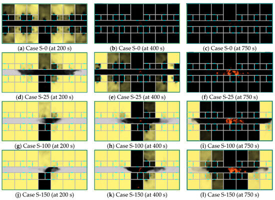 Figure 6 shows the smoke behavior according to the capacity levels of the smoke exhaust system. Figure 6a–c are the results at 200, 400, and 800 s after the fire in the absence of the smoke exhaust system (Case S-0). At 400 s after the fire broke out, smoke had spread to all units in the studio building. Figure 6d–f show Case S-25, where the capacity of the smoke exhaust system is 25% of the reference capacity, and it is observed that the smoke was relatively well controlled compared to Case S-0. Comparing Case S-100 (Figure 6g–i) and Case S-150 (Figure 6j–l), it is also shown that the greater the smoke exhaust capacity, the better the smoke control.