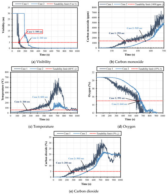 Figure 7 shows the results of visibility, carbon monoxide (CO), temperature, oxygen (O2), and carbon dioxide (CO2) on the right front of Exit A in Case S-0. In the figure, the red dotted lines represent the tenability criteria provided by [23], as shown in Table 4.
