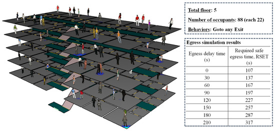 Figure 12 presents an egress simulation model of a residential building for validation purposes. Considering the floor area of the building, it was assumed that 15 people resided on one floor. The egress delay time was evaluated at 30 s intervals. The width and speed of the occupants were consistent with those outlined in Section 3 (Egress Simulation Model and Results). It appears that in scenarios where the smoke exhaust system capacity was set at 25% and the egress delay time was 0 s, all occupants successfully completed egress within 85 s. As the egress delay time increased, the success of evacuation became compromised. While all occupants were able to egress successfully when the egress delay time was 60 s, none of the occupants on the 5th floor managed to complete egress when the egress delay time exceeded 120 s.