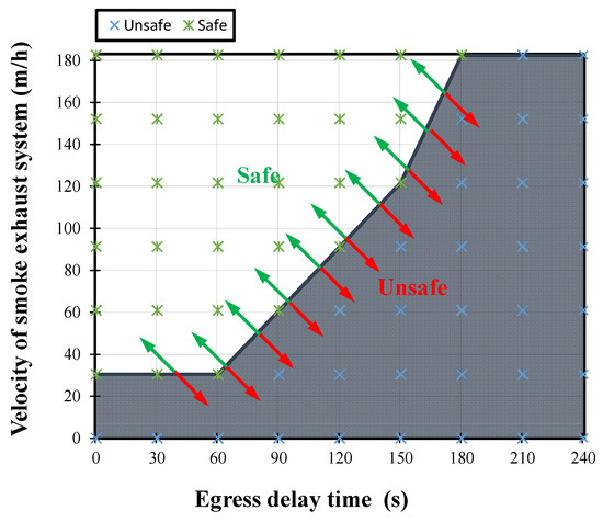 The egress safety criteria presented in Figure 9 were derived from the findings of the egress safety evaluation outlined in Table 5. The x-axis of the figure represents the egress delay time, while the y-axis denotes the capacity of the smoke exhaust system divided by the building’s floor area. The line on the graph serves as a standard for distinguishing between safe and unsafe scenarios. Cases falling above the line were deemed safe in the egress safety evaluation, whereas cases below the line were considered unsafe. These criteria have been proposed to provide a concise means of assessing the egress safety of mid-corridor type studio buildings, utilizing parameters such as the capacity of the smoke exhaust system, building area, and egress delay time. They offer a practical tool for evaluating the egress safety of studio buildings currently in use or under design, and for establishing additional safety measures as needed. In cases where the egress safety evaluation indicates an unsafe scenario, these criteria can help determine the necessary adjustments to ensure safety. This might involve reducing the egress delay time or increasing the capacity of the smoke exhaust system to meet egress safety standards.