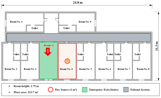 Figure 10 shows a new studio building for validation of the egress safety criteria proposed in this study. It is a mid-corridor studio building that has the same floor type as the prototype building, but its size and floor plan are somewhat different from the prototype. The ASET and the RSET were determined by performing fire and egress simulations on a five-stories studio building measuring 24.8 m × 11.3 m, and the evaluation results were compared and analyzed with the results of the proposed egress safety criteria.