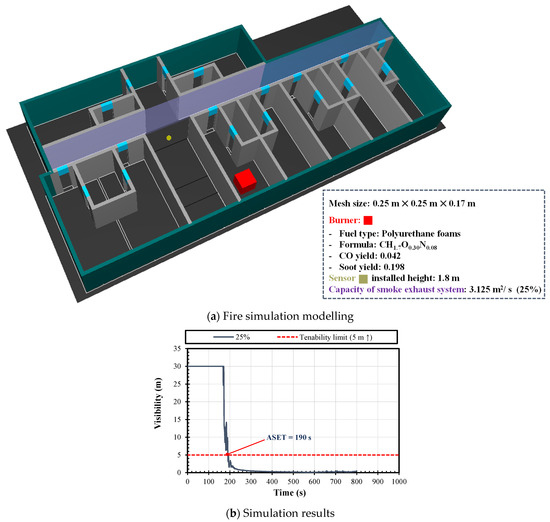 Figure 11a illustrates a fire simulation model of a studio building used for validation purposes. In this model, the capacity of the smoke exhaust system was assumed to be 3.125 m2/s, which corresponds to 25% of the reference capacity. The smoke exhaust system was installed in the corridor. The fire location was selected as a room adjacent to the exit, representing a worst-case scenario. The assumptions for the fire simulation align with those presented in Section 2 (Fire Dynamic Simulation Model and Results). The ASET was determined to be 190 s based on visibility considerations, as shown in Figure 11b.