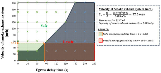 Figure 13 shows the results of evaluating the egress safety of the studio building presented in Figure 10 using the proposed egress safety criteria. The floor area of the studio building divided by the capacity of the smoke exhaust system was 52.6 m per hour. The maximum egress delay time to ensure egress safety was approximately 82 s. Upon considering the egress delay time at 30 s intervals, the evaluation indicates that egress safety is achieved when the egress delay time ranges from 0 to 60 s. However, beyond this threshold, from 60 to 240 s, the scenario is deemed unsafe in terms of egress safety. Remarkably, these observations closely mirror the results obtained from the egress safety evaluation conducted using fire and egress simulations, as depicted in Figure 12. This consistency reaffirms the reliability and validity of the proposed egress safety criteria in assessing the safety of studio buildings during emergency evacuation scenarios.