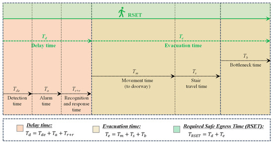 In this study, a simple evaluation was proposed to derive the RSET for evacuation safety evaluation without performing complex egress simulation. A timeline of the determinants of the RSET is shown in Figure 14. The factors that affect the RSET can be broadly categorized as the delay time (Td) before evacuation begins and the evacuation time (Te) after evacuation begins. Here, the delay time includes the detection time (Tde) to detect the fire, the alarm time (Ta) to disseminate the fire situation through the alarm, and the occupant’s recognition time and response time (Tr+r) to the fire situation, which are determined by the building’s use, alarm system, CCTV, etc. In this study, the evacuation time was categorized into three types of times. The first is the movement time (Tm) from the occupant’s current location to the doorway, which is calculated by dividing the total distance traveled by the occupant by the occupant’s egress speed. The second is the stair travel time (Ts) for occupants to travel down the stairs, which, like Tm, is calculated by dividing the distance traveled down the stairs by the occupants’ stair travel speed. The third is the bottleneck time (Tb) that occurs during occupant evacuation. It is difficult to estimate the exact value of Tb because it is affected by many factors, such as the width of the hallway, the width of the stairs, the width of the door, and the total number of occupants. Therefore, in this study, Tb was estimated by comparing simulation results with a simple evaluation.