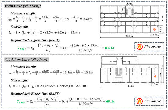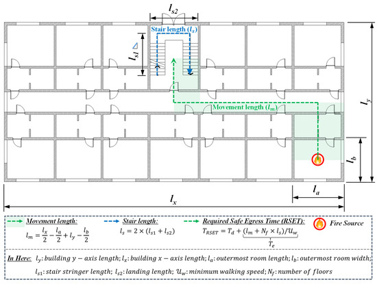 Generally, the RSET is determined by the person with the greatest distance from the occupant’s current location to the exit. The occupant at that location may be determined based on the slowest moving occupant in the building by age and gender. As shown in Figure 15, a simple evaluation model for the RSET of a mid-corridor type residential building was presented in this study. The proposed model is determined by building y-axis length, building x-axis length, outermost room length, outermost room width, stair stringer length, landing length, minimum walking speed, and number of floors. The movement length of a mid-corridor residential building was the distance from the exit to the exit from the position farthest from the exit in the floor plan (the center of the room). The stair length was calculated by considering the distance traveled to go down the stairs to the first floor.