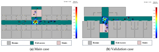 Figure 16 shows the results of deriving the RSET of the prototype residential building and the validation case residential building by the proposed evaluation model and comparing them with the egress simulation results. The RSETs of the prototype residential building and the validation case residential building were calculated to be 84.4 s and 68.1 s, respectively, assuming that the egress delay time and the bottleneck time are 0 s. According to the previous egress simulation results, the RSETs of the prototype residential building and the validation case residential building were 107 s and 85 s, respectively, when the egress delay time was 0 s. The difference between the proposed simple evaluation model and the egress simulation showed 19.8% and 21.1% in the two cases, respectively, which is judged to be affected by the bottleneck at the exit as shown in Figure 17. In other words, Tb can be calculated to be 22.6 and 16.9 s in the two cases, respectively. Even for a residential building with a relatively small number of occupants, it is estimated that bottlenecks can cause evacuation delays (Tb) of 20% of the RSET. This will increase as the number of occupants increases and the width of the exit becomes narrower. Using the proposed simple evaluation model, it is possible to quantitatively evaluate the time caused by bottlenecks.