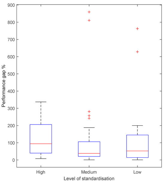 Possible links between the Performance Gap and the general assessment approach can be explored by assigning each building to a category based on certain features of the calculation methodology used for the EPC assessment (as described in Table 3). Figure 3 depicts the distribution of the Performance Gap for the case study buildings based on standardisation levels in the methodologies used for EPC calculations in each country.