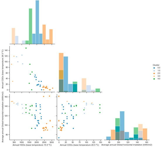 Building clustering according to the Heating Degree Days, Cooling Degree Days, and annual global horizontal irradiation [26].