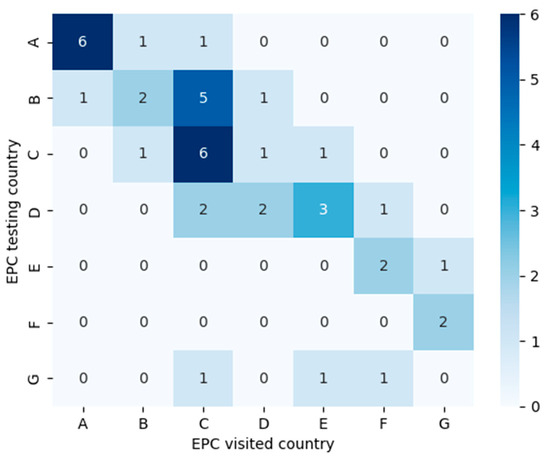 Figure 5 presents a summary of the cross-testing results. The vertical axis represents the energy label resulting from the native EPC assessment for each building; the horizontal axis represents the energy category resulting from a foreign EPC assessment. The numbers indicate the number of times that a building with each native category was given each of the foreign categories. For instance, the number 5 in row B, column C indicates that five buildings that were labelled as B in their native assessments were labelled as C in a paired foreign assessment.