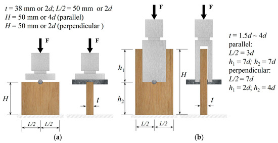 In the assessment of embedment strength, two test set-ups are commonly utilized, namely half-hole and full-hole tests, as illustrated in Figure 1. The half-hole test involves the application of a uniform compressive load along the length of the fastener, which results in an even distribution of stress beneath the fastener’s surface, across the thickness of the specimen. In the full-hole test, the compressive load is applied to the protruding ends of the fastener, resulting in an uneven stress distribution along the specimen thickness. The half-hole test setup is based on the experimental research conducted by Wilkinson [19]. He conducted half-hole compression tests on a variety of wood species, including Douglas fir, southern pine, and other wood products, considering different fastener diameters and the specimen thickness. The full-hole test is based on a series of studies conducted by Whale and Smith [20,21]. They assessed the embedment strength of five European softwoods and two hardwoods through tensile or compression full-hole tests, with an investigation of the impact of bolts with different diameters. The American standard ASTM D5764 [22] employs the half-hole test method for the assessment of the embedment strength of wood and wood-based products. In contrast, the European Standard EN 383 [23] employs the full-hole test for evaluation purposes. The two distinct test set-ups have different requirements with respect to the test specimen. Figure 1 illustrates the specific requirements for the test specimen as set forth in ASTM D5764 [22] and EN 383 [23].