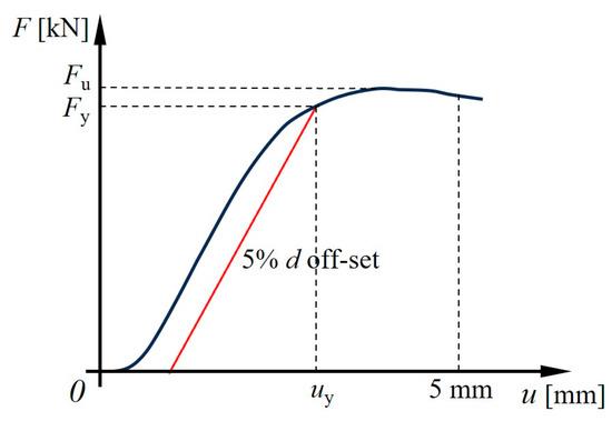 where represents the load at the intersection of the load–displacement curve and the 5% dowel diameter off-set line; is the maximum load within the initial 5 mm displacement. The aforementioned characterizing values are schematically illustrated in Figure 3. It is noteworthy that in some cases, a descending segment may not be observed within the initial 5 mm displacement in the load–displacement curve, particularly when the load-to-grain angle is large.