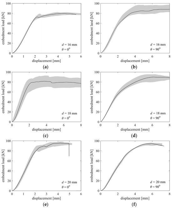 Embedment load–displacement curves for different bolt diameters: (a) d = 16 mm and = 0°; (b) d = 16 mm and = 90°; (c) d = 18 mm and = 0°; (d) d = 18 mm and = 90°; (e) d = 20 mm and = 0°; (f) d = 20 mm and = 90°.