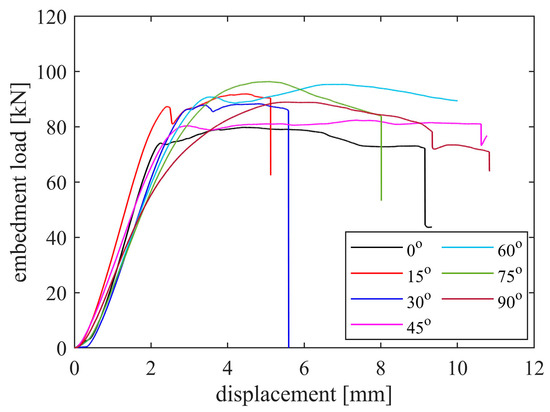 A total of seven series of embedment tests were conducted, with each series representing a specific load-to-grain angle ranging from 0° to 90°, with a 15° increment. The representative embedment load–displacement curves for each loading angle are presented in Figure 6. The curves of the 15° and 30° specimens exhibit a sudden decline at a displacement of approximately 5 mm, accompanied by the presence of cracks throughout the specimen (Figure 4b,c). This observation aligns with the characteristics of brittle failure. Cracks were also observed on the 0° specimen, which subsequently failed when the displacement reached 9 mm. The embedment load–displacement curves at other loading angles demonstrate notable ductility, which is in accordance with the failure mode illustrated in Figure 4.