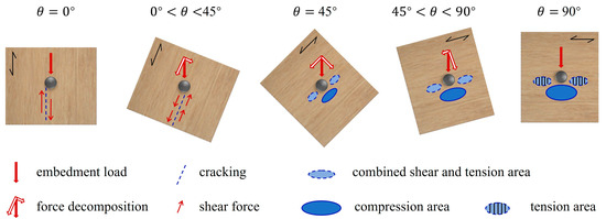 As an anisotropic material, bamboo scrimber demonstrates a compressive strength of 23.14 MPa and a tensile strength of 4.43 MPa perpendicular to the grain direction. Its shear strength parallel to the grain is 8.21 MPa. Figure 8 provides a schematic diagram of the stress occurring in bamboo scrimber specimens at varying loading angles, which facilitates an understanding of the underlying causes of the variation in embedment strength. The specimen fails as a result of shear action at 0°. The embedded strength can be attributed to the contribution of shear strength parallel to the grain. When the loading angle is below 45°, the specimens still undergo shear failure. Nevertheless, the shear force acting on the failure surface is the parallel-to-grain component of the embedment load. Consequently, greater embedment loads are required to induce shear failure. As illustrated in Figure 8, when the load-to-grain angle is 90°, the fiber situated directly beneath the bolt is compressed, and the materials on both sides of the bolt are subjected to tensile stress perpendicular to the grain direction, resulting in a pronounced tearing phenomenon (Figure 4). The embedment strength of the 90° specimen is dependent on both the tensile strength and the compressive strength of bamboo scrimber perpendicular to the grain direction. When the load-to-grain angle is between 45° and 90°, the fiber crushing and tearing phenomena are less severe than at 90° due to the action of the perpendicular-to-grain component. This consequently yields a greater embedment strength than that obtained at 90°. When the load is applied at 45°, the two orthogonal components work together to form a combined shear and tension area in the vicinity of the bolt hole. As previously stated, the tensile and shear strengths of the bamboo scrimber perpendicular to the grain direction are relatively low, resulting in a reduction in the embedment strength at 45°.