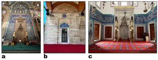 A tile is an architectural element that provides linguistic unity between the different spaces of the mosque. The analyses revealed repetitive use of panel patterns in all mosques, except the Fatih Mosque, confirming the use of templates in the sultanic mosques that we studied. When the mosque’s exterior and interior organization are considered, it is seen that, following the symmetrical design approach of the mosque structure and space design, the layout and patterns of the tile compositions are always symmetrical. The tiles were manufactured in a manner that precisely matched the architectural elements and effectively addressed the architectural problem. Special spaces like the spaces used directly by the sultan are identified using unique tiles or colors that are not visible in other areas of the building.