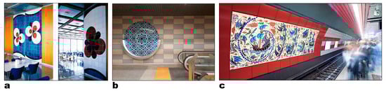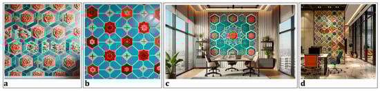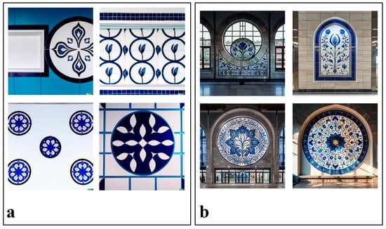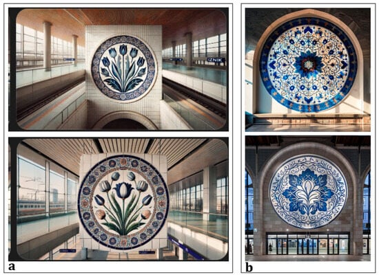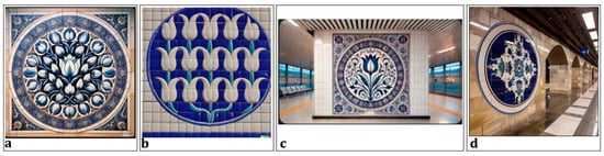 The implementation phase of the prompts proceeded as follows with the initial prompt. On the selected artificial intelligence tool, the prompts were tested sequentially, starting with “An Iznik tile panel with white and cobalt colors” followed by “An Iznik tile panel consisting of rectangular modules with white and cobalt colors “and then “An Iznik tile panel with a tulip motif consisting of rectangular modules with white and cobalt colors”, “A circle formed Iznik tile panel with tulip motif consisting of rectangular modules with white and cobalt colors”, “A circle formed Iznik tile panel with tulip motif consisting of rectangular modules with white and cobalt colors on one wall”, “A circle formed Iznik tile panel with tulip motif consisting of rectangular modules with white and cobalt colors on one wall of a train station”, “A circle formed Iznik tile panel with tulip motif consisting of rectangular modules with white and cobalt colors on one wall of the semi-open area in the train station”, “A circle formed Iznik tile panel with tulip motif consisting of rectangular modules with white and cobalt colors on one wall of the semi-open area of the public interior of the train station”, “A circle formed Iznik tile panel with tulip motif consisting of rectangular modules with white and cobalt colors on one wall of the semi-open area of the public interior of the train station in the city”, “A circle formed Iznik tile panel with tulip motif consisting of rectangular modules with white and cobalt colors, located on the upper parts of the windows on one wall of the semi-open area of the public interior of the train station in the city”, “A circle formed Iznik tile panel with tulip motif consisting of rectangular modules with white and cobalt colors, located on the upper parts of the windows on one wall of the semi-open area of public-interior of the train station in the city, minimalist style”, and, finally, “A circle-formed Iznik tile panel with a tulip motif consisting of rectangular modules with white and cobalt colors, located on the upper parts of the windows on one wall of the semi-open area of the public interior of the train station in the city, minimalist style, dynamic”. The same procedure was repeated for the other prompt, with adjectives added to the sentence in the order specified in the method.