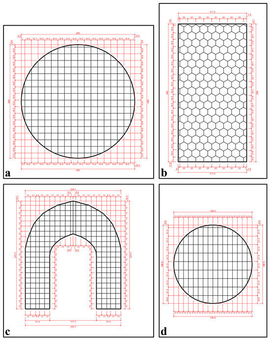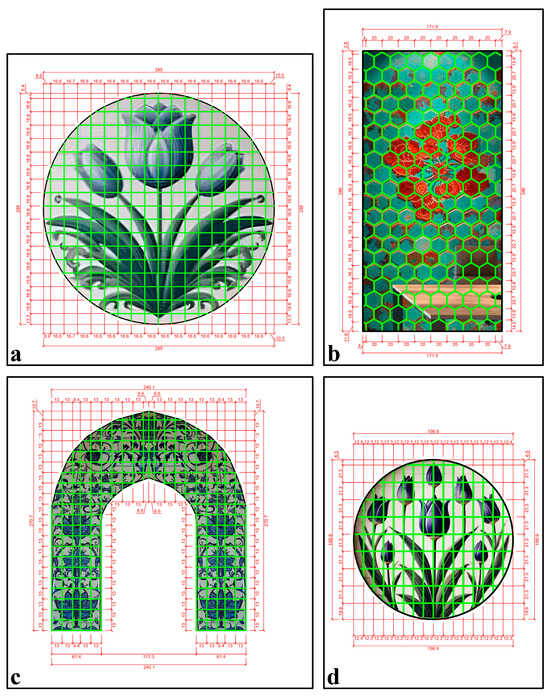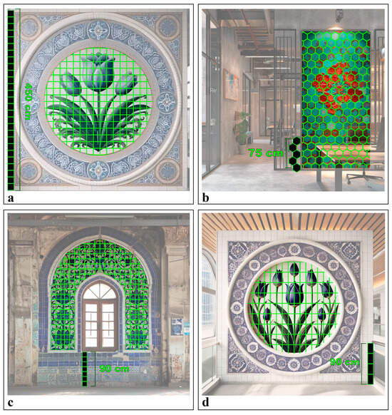 Figure 5a, the height of the wall on which the panel is located was estimated to be 450 cm, and the ceramic panel was scaled according to this reference. Finally, based on the scaled drawings, the approximate dimensions of the ceramic panels and the unit tiles composing them were measured using the CAD software (