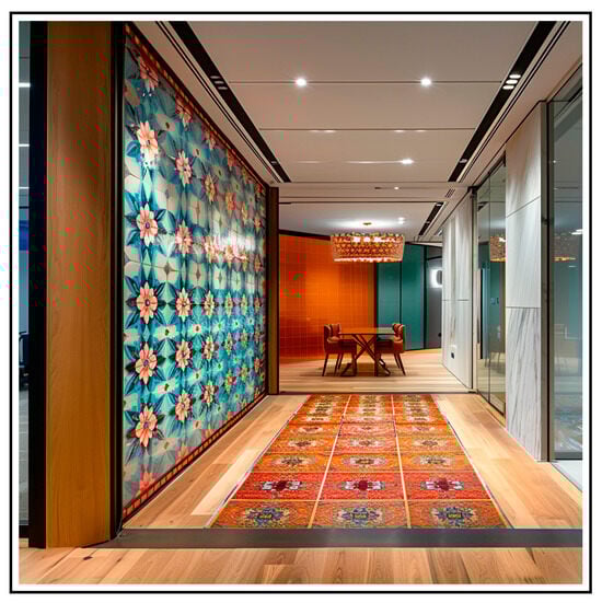 In terms of the relationship between color and space, we found that, despite no specific color being defined for the elements of the architectural space except the tile surface, the Midjourney tool used colors on various surfaces or furniture within the space that harmonized with the tile design, proposing a consistent color palette for space, thus better integrating the tile surface with the modern interior (