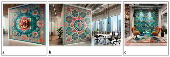 Figure 17c, it produced an arch-shaped panel with dimensions of 240.1 × 270.7 cm. The panel dimensions generated by AI are generally larger than traditional panel sizes. It is remarkable that, in the AI-generated images, unlike real-life examples, there is no clear relationship between panels and the tiles composing them in terms of shape and size. Another result of our analysis of the dimensions and shapes of the panels in the AI-generated images is that panel sizes and scales and their relationships with the other architectural elements in the space vary to a high extent depending on the architectural context in which they are used, as is the case in real-life traditional examples.