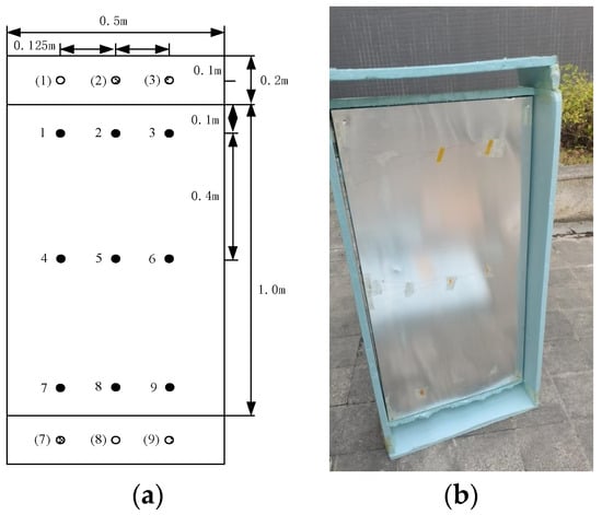 Using the headlights provided in the laboratory, the cover plate was illuminated. The lights were set to vary the solar intensity from 200 W/m2 to 800 W/m2 by controlling the voltage and current input, with a gradient of 100 W/m2. To ensure consistency between the input and output of the heat flow boundary, it was necessary to measure the temperature of the heat flow boundary. A K-type thermocouple was employed to measure the temperature distribution of the heat flow boundary, calibrated in a 3 × 3 matrix format as shown in Figure 3a. Similarly, a 3 × 3 matrix was used to measure the air distribution within the flow channel, with the exception that the upper and lower thermocouples were placed at the mid-plane positions of the upper and lower outlets, as indicated by the dotted fill points in Figure 3b. A hot-wire anemometer was used to measure the wind speed at the midpoint of the inlet and outlet positions in Figure 3b, to analyze the enhancement mechanism of natural ventilation. The above tests were repeated three times, and the average values were taken to eliminate the interference of human errors on the experimental data.