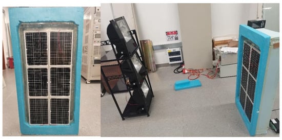 After completing the experimental research on the equally scaled Trombe wall system, the experiment was upgraded by purchasing several PV panels of 0.21 m by 0.31 m dimensions. These PV panels were closely attached to the glass cover plate, forming an external PV—Trombe wall system. Experiments were then conducted under a solar intensity of 600 W/m2 to investigate the thermoelectric correlation under varying coverage ratios. Specifically, experiments were conducted with 2, 4, and 6 PV panels covering the system, respectively, to explore their effects. The construction of the PV—Trombe wall experimental platform is shown in Figure 4.