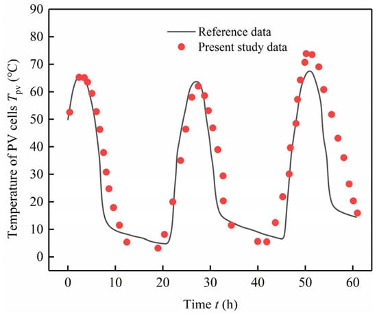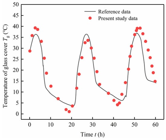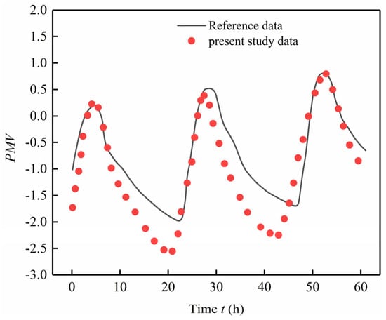 Using the parameters such as solar intensity and outdoor temperature from the reference paper as initial boundary conditions, the relative humidity was set at 50%, and the wind speed at 0.2 m/s. The reliability of the model presented in this document was verified by comparing the numerical simulation results with those from reference []. The enclosure glass temperature Tg, PV temperature Tpv, and thermal comfort index PMV were adopted as validation indicators, with the validation results presented in Figure 6, Figure 7, and Figure 8, respectively.