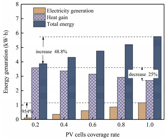 The PV panel coverage rates of zero, two, four, and six panels are, respectively, 0%, 26.04%, 52.08%, and 78.12%. As the PV panel coverage rate rises, the total power generation increases, but the thermal efficiency decreases, significantly impacting temperature while the change in power generation efficiency remains relatively small.