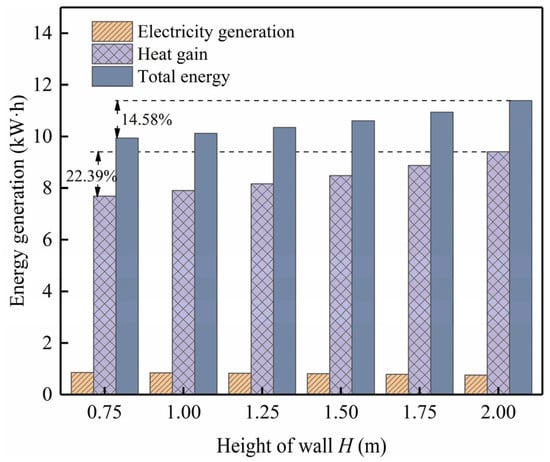 As shown in Figure 10, when the height of the air channel varies from 0.75 m to 2 m, the system’s daily total heat gain increases from 7.68 kWh to 9.40 kWh, representing a growth rate of 22.39%. Conversely, the system’s daily total electricity generation decreases from 0.85 kWh to 0.75 kWh and reaches a decline of 11.76%. With the increase in air channel height, the comprehensive utilization of solar energy by the Trombe wall system increases from 9.94 kWh to 11.39 kWh, marking a growth of 14.58%. From the above, it can be inferred that the overall increase in the system’s total effective utilization of solar energy is less than that of heat gain. This is primarily attributed to the decrease in electricity generation caused by the elevated temperature on the battery surface as a result of the increased air channel height.