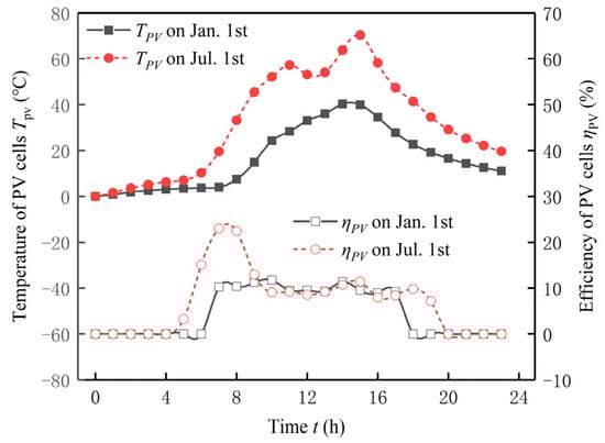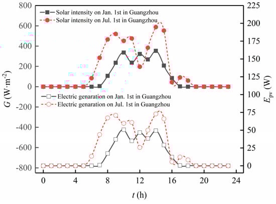 Figure 11 and Figure 12, respectively, examine the electricity generation, battery temperature, and power generation efficiency of the PV—Trombe wall throughout a day during the winter and summer seasons in a hot summer and warm winter region. As depicted in Figure 8, the trend of solar panel electricity generation follows that of solar radiation intensity, with both reaching their peak values between 14:00 and 15:00. The results for solar cell temperature and power generation efficiency are shown in Figure 9. Throughout the day, the power generation efficiency first increases and then decreases. Combining Equations (5) and (9), it is evident that the power generation efficiency decreases as the temperature of the PV panel rises. As the day progresses and solar radiation intensity increases, the PV panel converts solar energy into both thermal and electrical energy. The thermal energy leads to an increase in the panel’s temperature, resulting in a decrease in electrical efficiency, and the temperature of the PV panel peaks at 15:00, coinciding with the lowest electrical efficiency. Taking into account both the system’s electricity generation and generation efficiency, on 1 January, the solar panel’s electricity generation is 317.26 W with an average generation efficiency of 4.62%. In contrast, on 1 July, the corresponding electricity generation can reach as high as 556.80 W, accompanied by a significantly improved average generation efficiency of 7.01%.