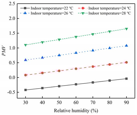 As can be observed from Figure 13, PMV gradually increases with the rise in relative humidity. This is because relative humidity primarily affects the body’s ability to dissipate heat. The higher the relative humidity, the more difficult it becomes for the human body to dissipate heat, leading to a sensation of heat and stuffiness when the relative humidity is excessively high. When the relative humidity changes from 30% to 90%, PMV at a system room temperature of 22 °C increases from −0.42 to −0.03, a rise of 0.38. Similarly, at a system room temperature of 28 °C, PMV increases from 1.1 to 1.65, an increase of 0.54. It can be seen that as the room temperature rises, the impact of relative humidity on the body’s heat dissipation becomes more pronounced, and an excessively high relative humidity can drastically affect indoor thermal comfort.