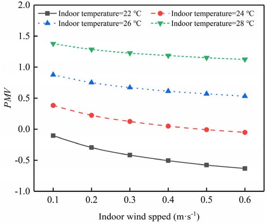 - As relative humidity escalates, the Predicted Mean Vote (PMV) of the system intensifies, particularly with rising room temperatures, progressing from 0.38 at 22 °C to 0.54 at 28 °C. This amplification exacerbates the influence on human heat dissipation, significantly compromising thermal comfort. Conversely, heightened air velocities lead to PMV reduction, improving from −1.0 to −0.63. Furthermore, at lower room temperatures, the impact of air velocity on human heat dissipation intensifies, notably influencing indoor thermal comfort levels.