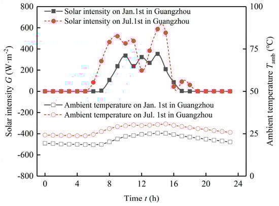 where Te, Tg, and TPV represent the ambient temperature, glass cover surface temperature, and solar panel surface temperature, respectively, °C; hg,amb are mixed heat transfer coefficients, including the radiative and convective heat transfer of glass to the outside world, W·(m2·K)−1, taken as 29; and hr_g,pv is the radiative heat transfer coefficient between the glass cover and the PV panel, which can be calculated according to the following formula [].