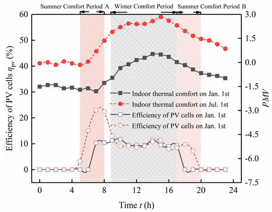The work presented in this paper aims to reveal the matching mechanism of optical and thermal energy efficiency in PV—Trombe walls, while analyzing their application potential. Therefore, the model performance evaluation indicators are provided based on the requirements, including electrical performance evaluation indicators, thermal performance evaluation indicators, and economic evaluation indicators. Among them, the solar panel’s power generation efficiency, the human thermal comfort evaluation index Prediction Mean Vote (PMV), and the Levelized Cost of Energy (LCOE) are selected as evaluation parameters for electrical performance, thermal performance, and economic performance, respectively.