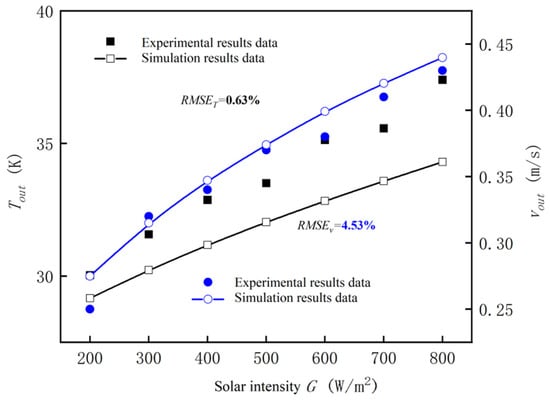 As can be seen from Figure 18, the difference between the experimental outlet temperature and the simulated outlet temperature is no more than 5 °C, and the difference between the experimental outlet velocity and the simulated result is no more than 0.05 m/s. The temperature error rate is only 0.63%, and the velocity error rate is only 4.53%, both of which are within 5%. Therefore, the experimental data exhibit good credibility and accuracy.