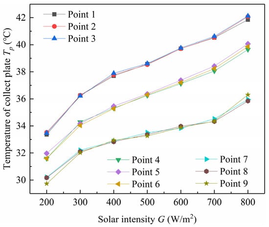 As depicted in Figure 19, which illustrates the relationship between solar intensity and the near-wall temperature of the collector plate, the temperatures at all measurement points rise concurrently with the increase in solar intensity. Specifically, the temperatures at points 1, 2, and 3 are higher than those at points 4, 5, and 6, which in turn are higher than those at points 7, 8, and 9. This phenomenon is attributed to the principle of thermal pressure, resulting in higher temperatures on the upper side compared to the lower side. The minimum temperature difference between the topmost and bottommost points is 3.63 °C, while the maximum temperature difference reaches 6.17 °C. After the system is activated, the collector wall absorbs a significant portion of solar energy. Initially, convection is relatively weak, and heat transfer primarily occurs through conduction on the wall surface. Since the wall temperature exceeds the air temperature, a vertical boundary layer forms. Over time, the boundary layer ascends, with its temperature gradually increasing, ultimately contributing to the trend of higher temperatures on the upper side compared to the lower side.