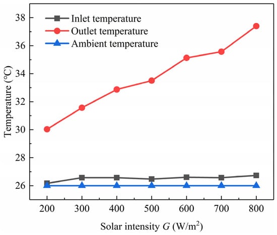 Ambient, inlet, and outlet temperature under different solar intensities.